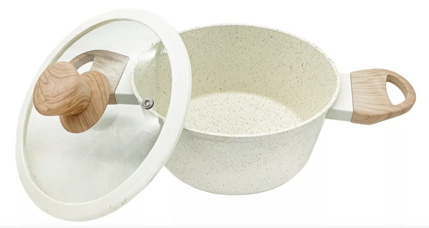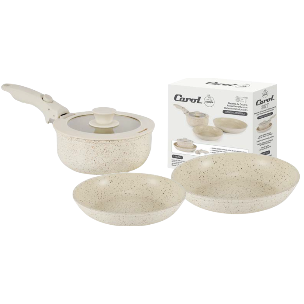 Juego de Bateria 5 piezas: Cacerola 18cm - Sarten 20cm - Sarten 26cm y Mango Extraible Con caja color (68005BGR) Beige CAROL