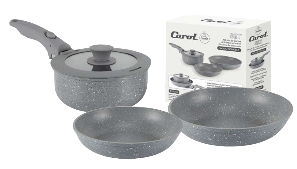 Juego de Bateria 5 piezas: Cacerola 18cm - Sarten 20cm - Sarten 26cm y Mango Extraible Con caja color (68005GGR) Gris CAROL